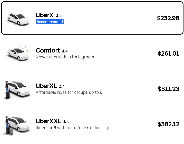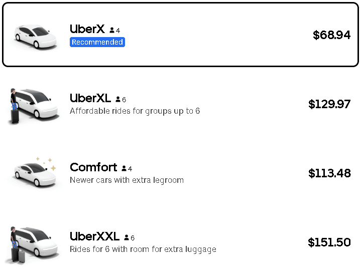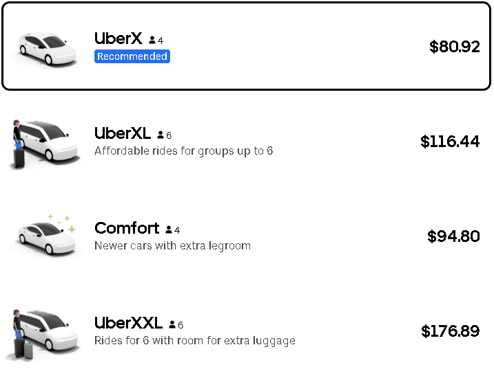 Uber prices are estimates as of February 2026.